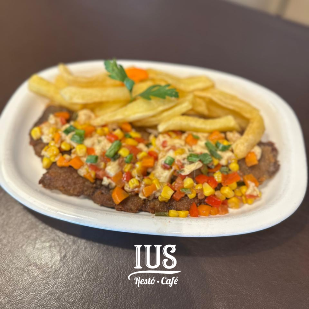 Milanesa de ternera o pollo salsa capresse y papas fritas